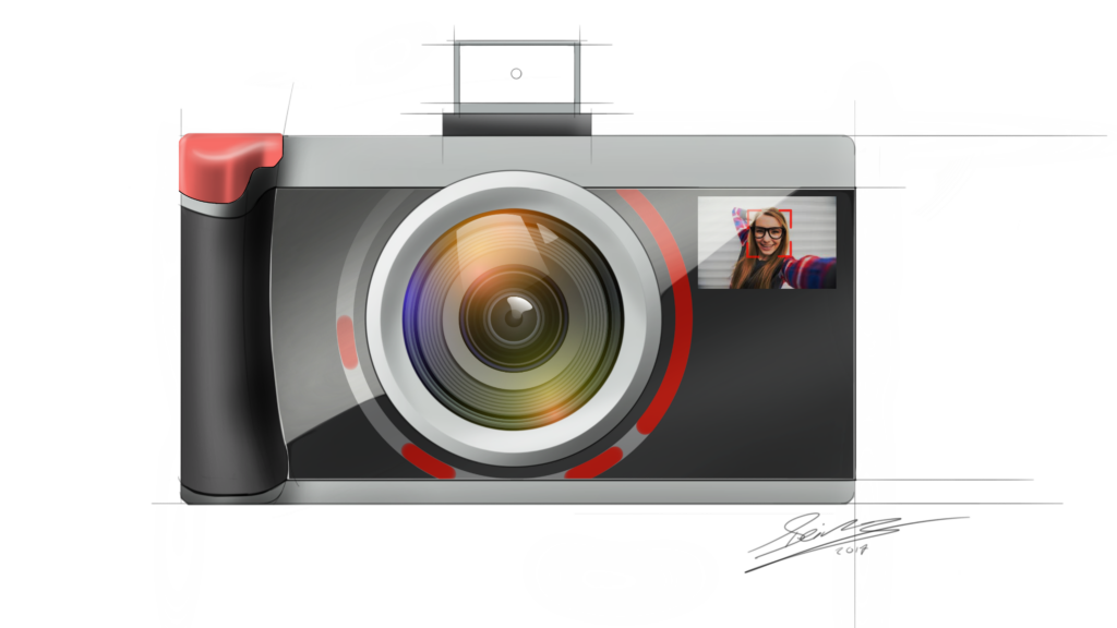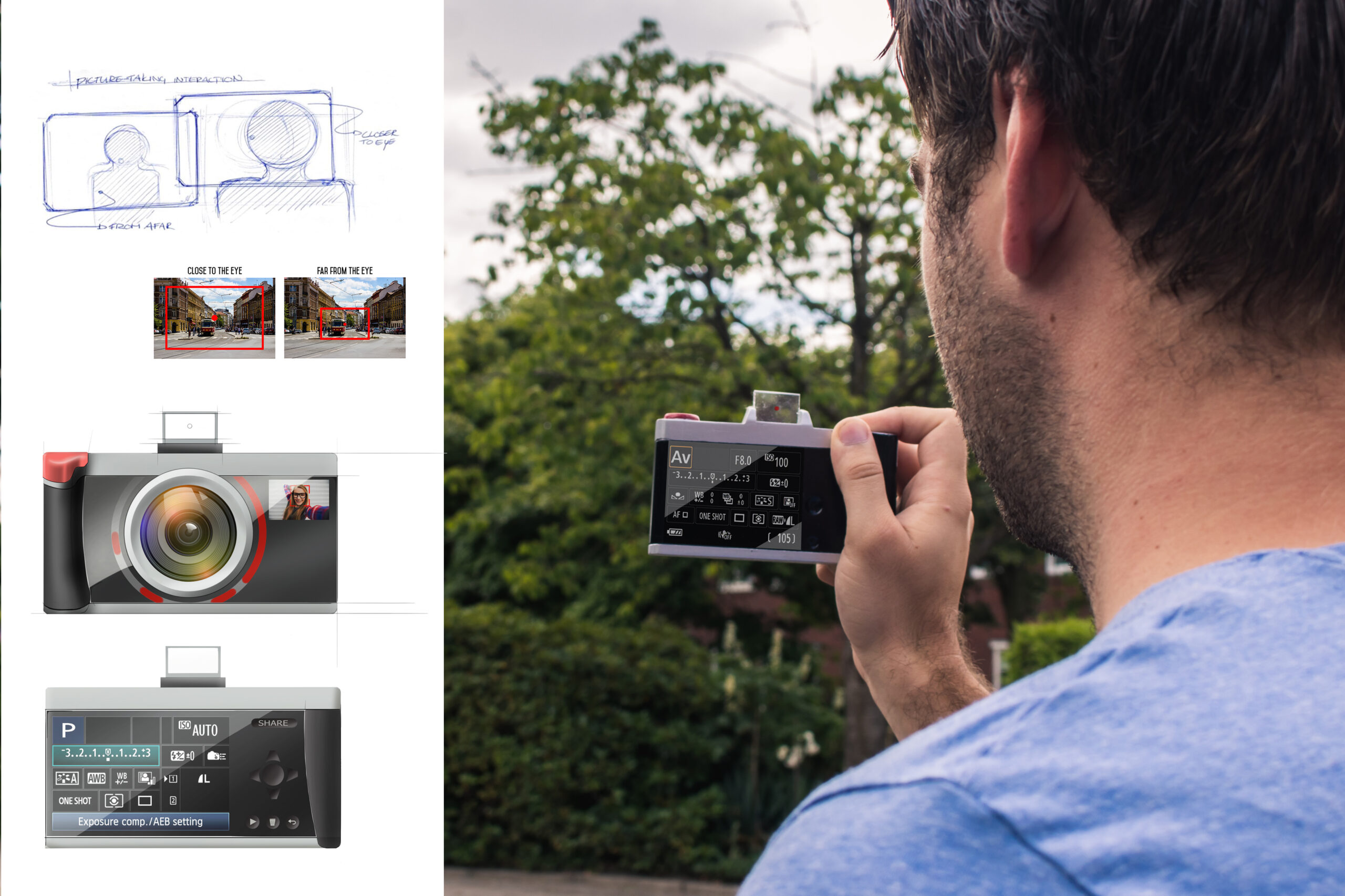 The design concept that resulted from this process is a digital photo camera that looks familiar and is based, in terms of styling, on existing camera designs and lies on the crossroads between a mirrorless camera and a smartphone camera (typicality). However, the interaction with the camera is designed to be novel. To prevent people from experiencing the world through the screen, like with many digital cameras and smartphones, the viewfinder (small window on top of the camera that you look through) is made a little bigger and the display does not show what the lens sees. This forces the user to look at the subject of the photo they’re taking more directly.
