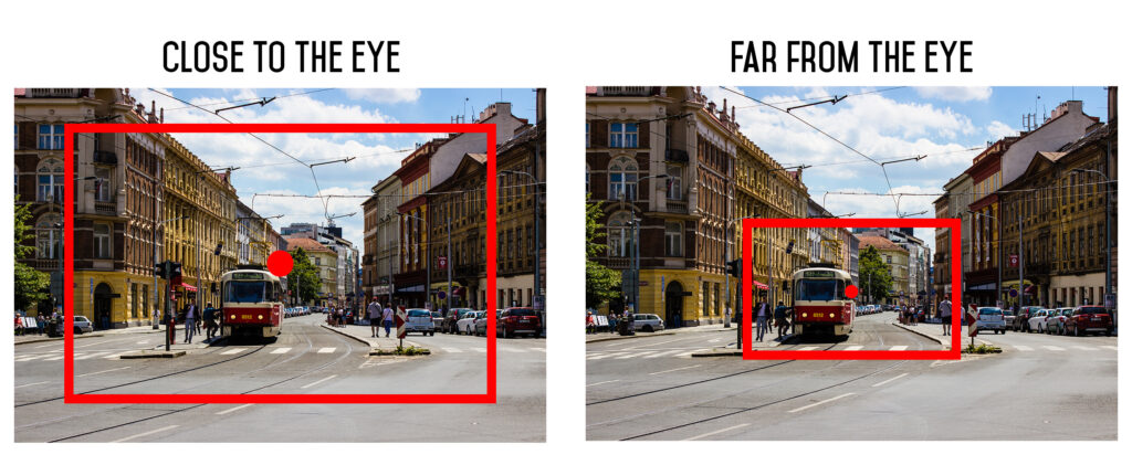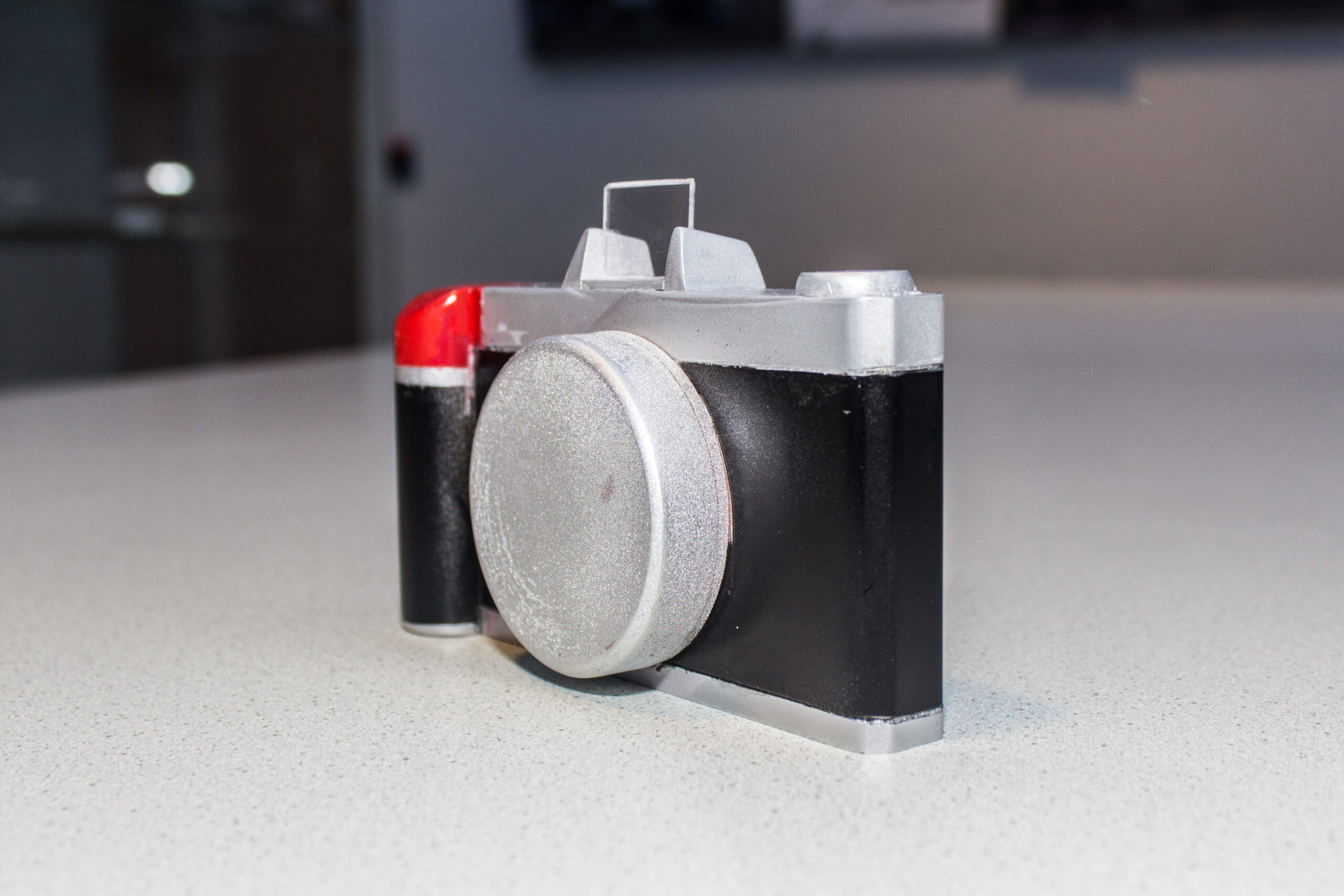 The core idea of the interaction is that the photo will be what you see through the viewfinder. That means that to zoom in, you have to move the camera away from the eye. To zoom out and get more of a wide angle, you move the viewfinder closer to the eye (see image below, the red rectangle indicates the viewfinder). Through this interaction you’re framing the world with your viewfinder, not unlike an artist framing their next composition with their hands. Through this design, we attempted to get to a more meaningful relationship with the photos that are taken.