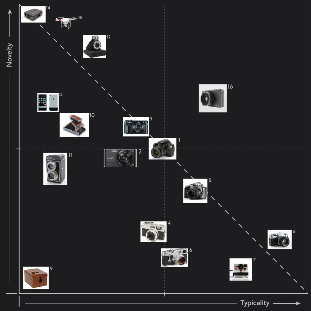 We ranked the cameras on two scales: novelty (how innovative is it?) and typicality (how recognizable is it?). The idea was that a novel product would lead to excitement with the user while typicality would lead to acceptance of the technology. This is not an uncommon idea in the world of design. Many designers are familiar with the MAYA principle. We visualized these rankings in the graph below. The goal was, after this analysis, to design a digital camera concept that would land in the top right quadrant of this novelty-typicality graph.
